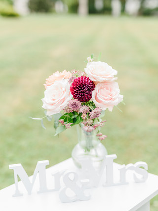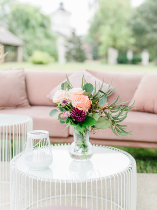 Ústředním barevným motivem byly tóny jemné růžové barvy v kombinaci s detaily v bordó. V této barvě jsme i vybrali lounge zónu, která na svatbách patří k nejvíce vyhledávaným místům. Mia z Atelier Daily pak tuto barevnou paletu skvěle zahrnula do květinové výzdoby.